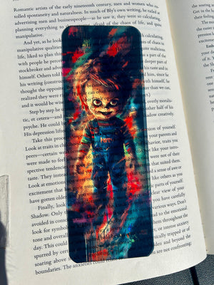 Chucky Bookmark with Surreal Neon Meltdown – Horror Art for Thriller Readers, Cult Film Fans, and Dark Fiction Collectors