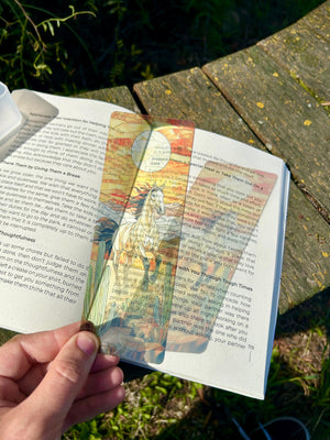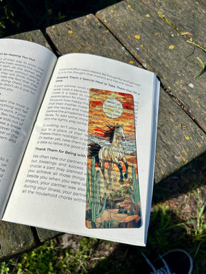 The Coolest Bookmarks You've Probably Ever Seen....This Desert Horse Bookmark beautifully captures the spirit of the wild, with a striking design of a horse galloping across a vast desert landscape. Perfect for horse lovers, nature enthusiasts, and those who appreciate the freedom of the open plains, this bookmark brings the beauty of the desert to your reading experience. Made from durable materials, it's a unique and functional accessory to mark your place in books, journals, or planners. A thoughtful and adventurous gift for anyone who loves horses and the great outdoors! Hand Made In Bend Oregon