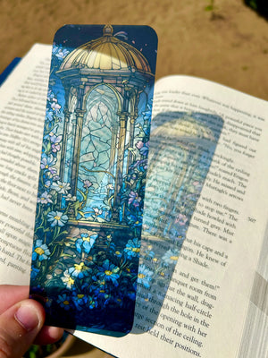 Golden Twilight Gazebo Bookmark – Enchanted Garden Fantasy Art, Stained Glass-Inspired Magical Ruins, Floral Gothic Bookmark