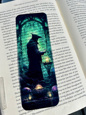Gothic wizard bookmark with glowing green spellwork and ancient sorcery, dark fantasy art for magic lovers and book collectors