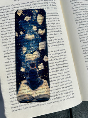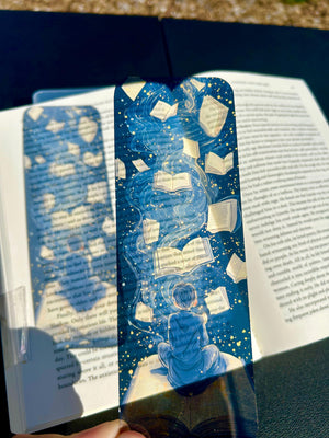 Magical bookmark of apprentice with glowing books floating in starry sky — perfect for fantasy lovers, dreamers, and bookworms