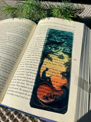Silhouette Reading Under Tree Transparent Bookmark – Sunset Scene Artistic Book Lover Gift with Nature Theme and Double-Sided Design
