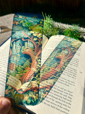 Storybook Treehouse Transparent Bookmark – Enchanted Forest Design with Open Book and Fantasy Scene for Book Lovers & Readers